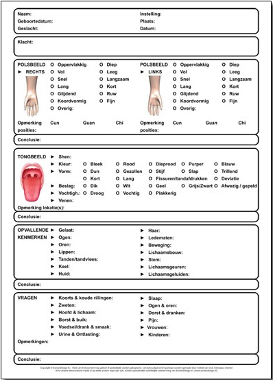 Geheel volgens de Chinese traditie worden 10+2 vragen gesteld om uw lichamelijke en geestelijke conditie in kaart te brengen Zo worden er vragen gesteld over: